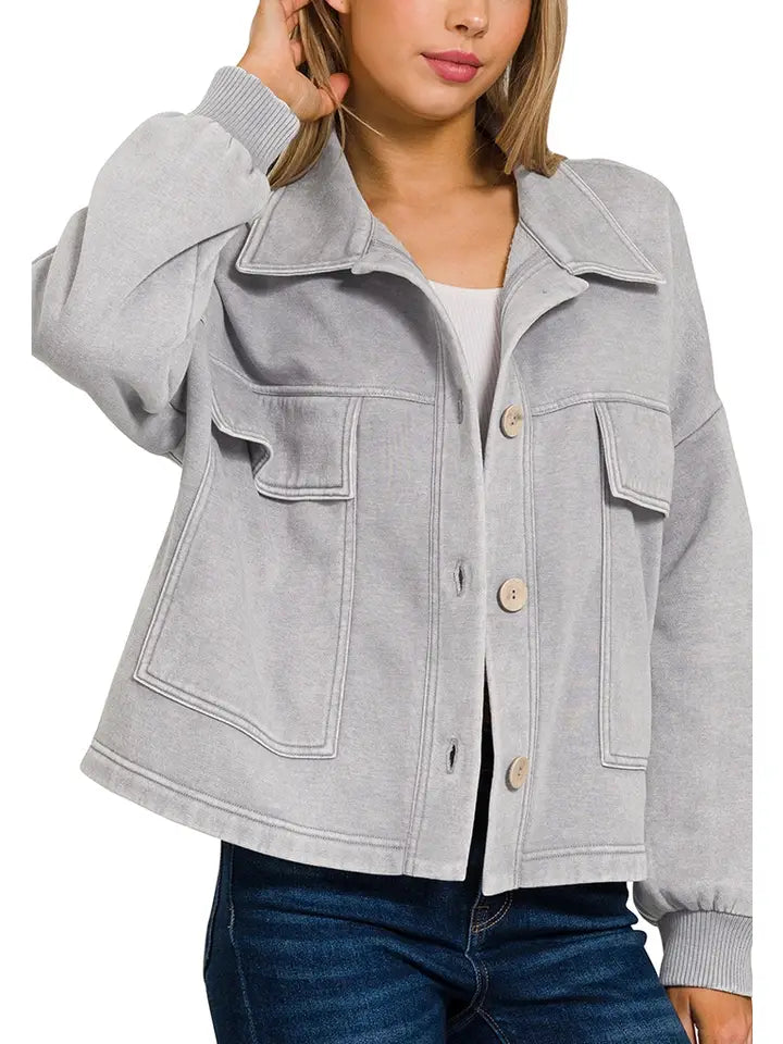 Acid Wash Fleece Front Pocket Cropped Shacket