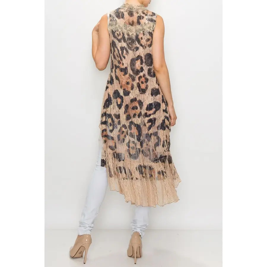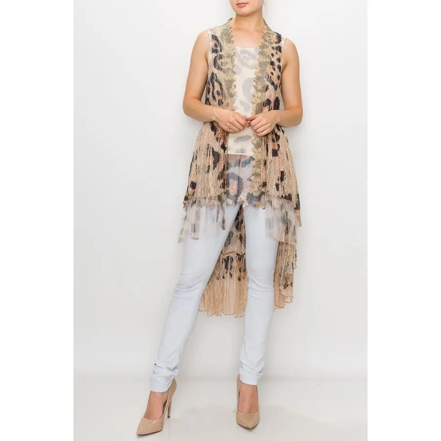 Experience the blend of fashion and comfort with our vest by Origami Apparel. This high-low all-lace vest boasts a unique leopard print, embodying our brand's commitment to stylish, on-trend, and classic designs. Inspired by lace and crochet, it's a wonderful addition to any contemporary woman's wardrobe. Perfect for downtown LA vibes or a casual day out, this vest is a testament to our brand's dedication to quality and style.