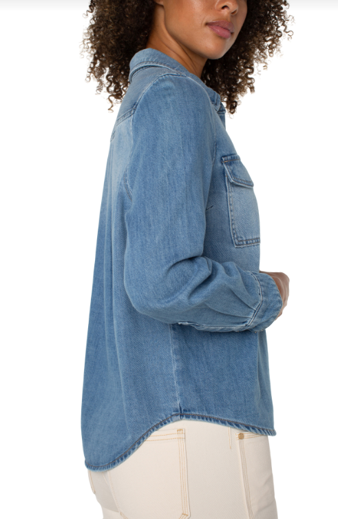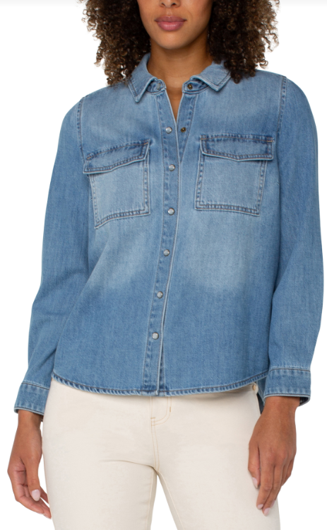 Our button-down denim shirt features pearlescent buttons making it an easy-to-wear piece that can be easily dressed up or down!