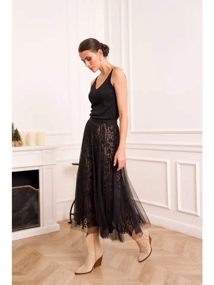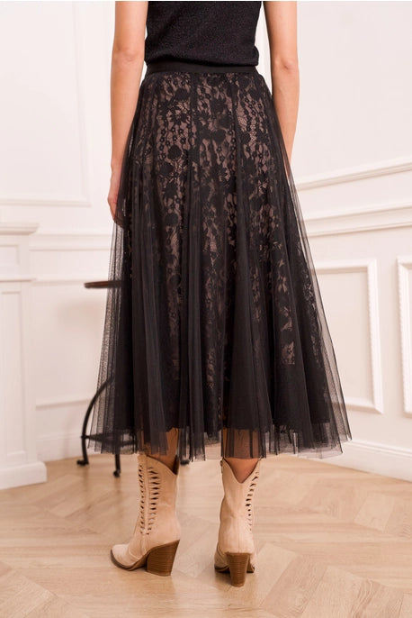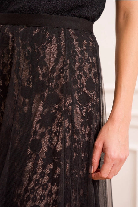 Bi-material skirt composed of three layers: tulle, lace and bottom of the skirt. Ruffle effect with the skirt.