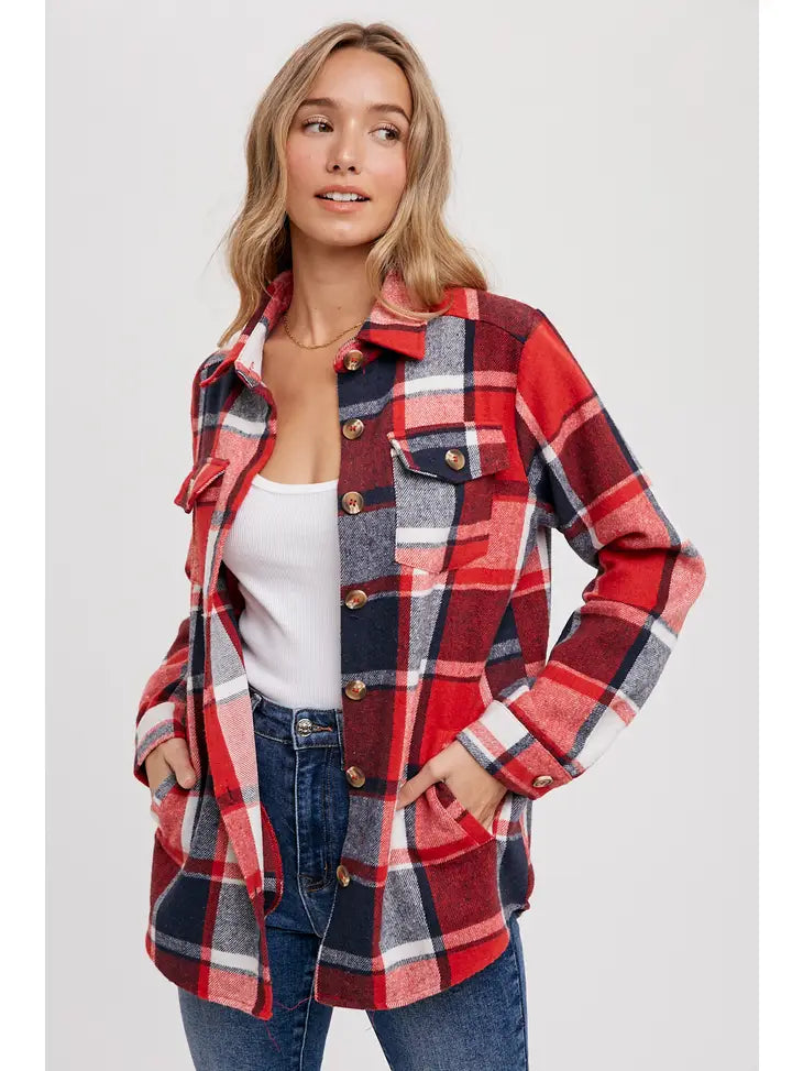 Flannel plaid shacket featuring a button-down front, long sleeves, two chest pockets & side pockets. Wear it alone as a cozy plaid shirt or layer over your favorite top as a cute jacket.