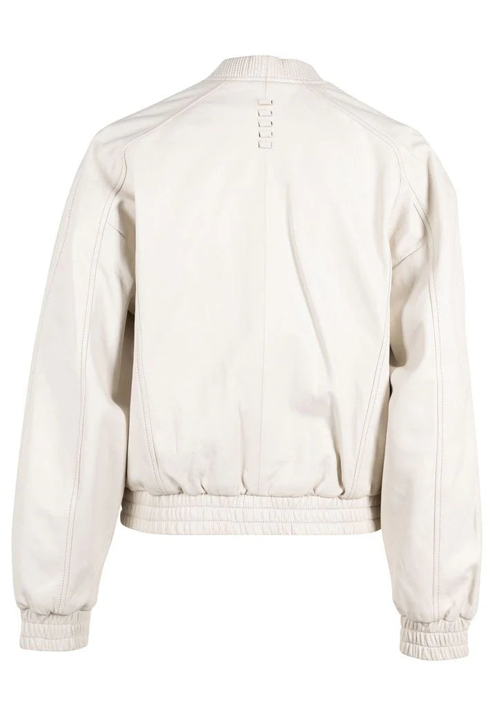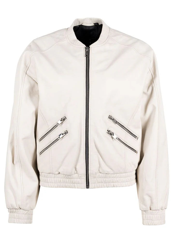 Fun, leather bomber jacket from Mauritius and a springy off-white. We love the contrast, trim and zipper details! We found the style were pretty true to size, however, the sleeves were a tiny bit short. Heads up if you struggle with arm length in your garments.