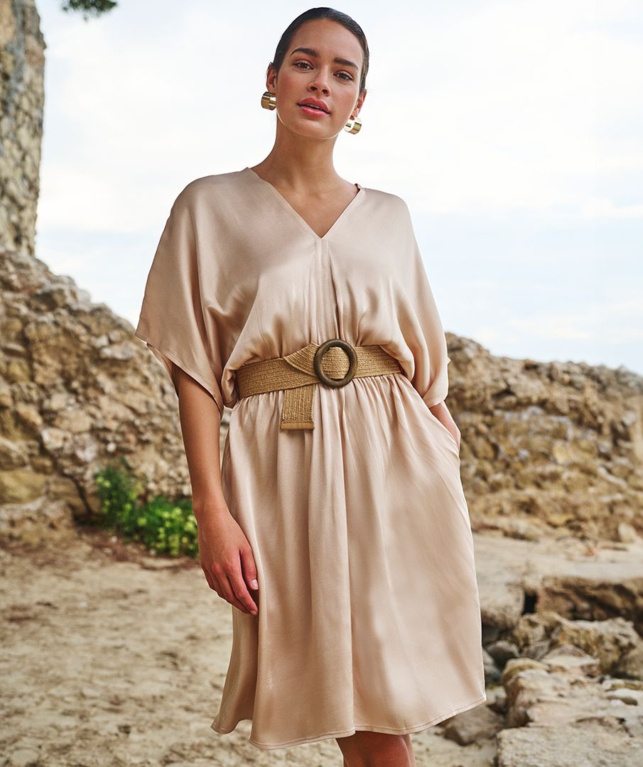 Satin dress with batwing sleeves. The dress has a v-neckline at the front and back and can be tied at the back. The dress has a knee length and sewn-in elastic at the waist.