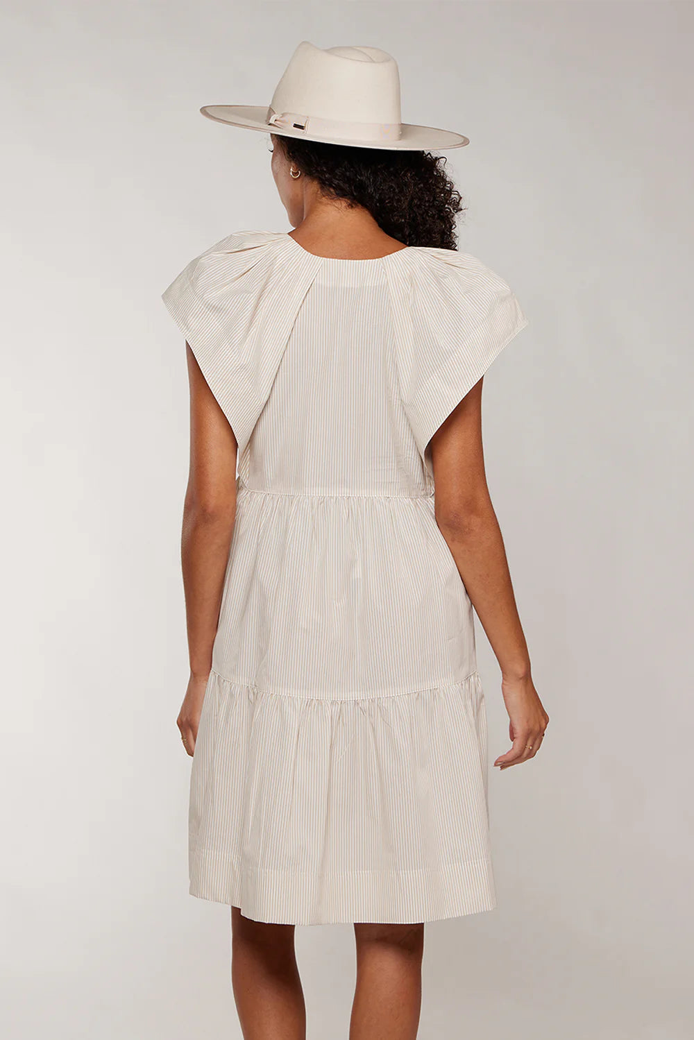 The Keely Tiered Dress is a lightweight, 100% Cotton, v-neck relaxed fit mini dress featuring adorable exaggerated flounce sleeves, delicate beige stripes and must-have pockets. Feminine, yet still easy-going, the Keely makes getting dressed a breeze. Since this is a loose fitting item you may want to consider sizing down if you are between sizes and prefer less of a loose fit.