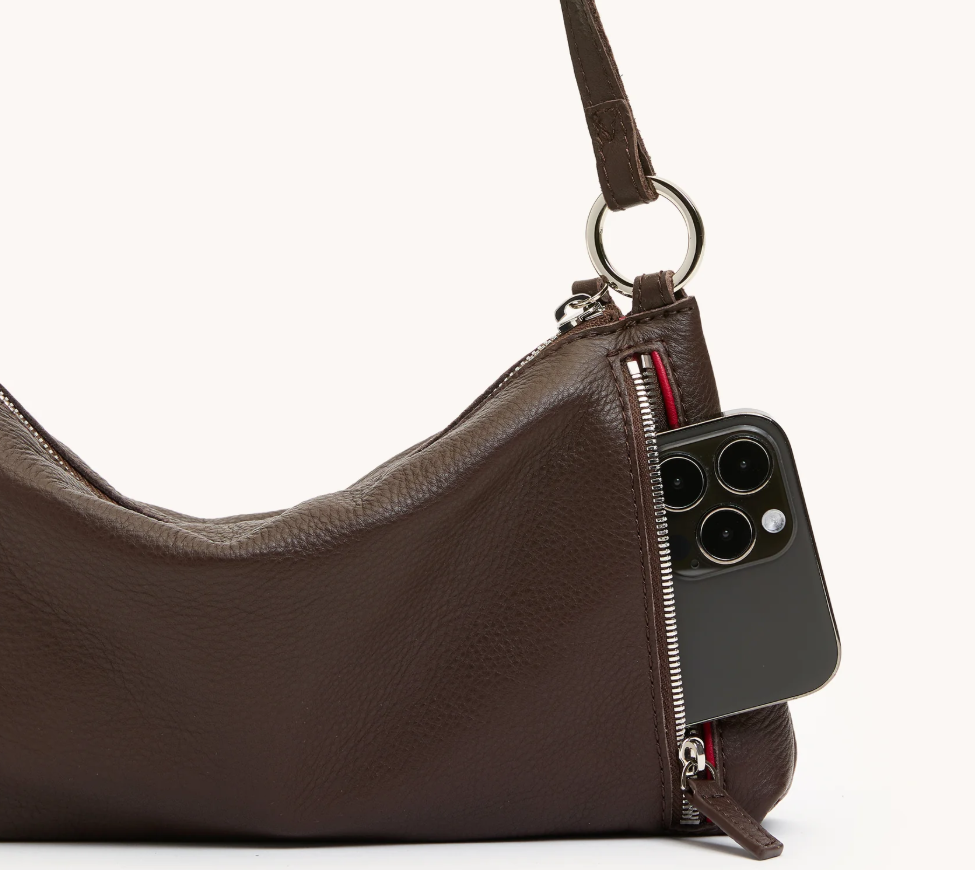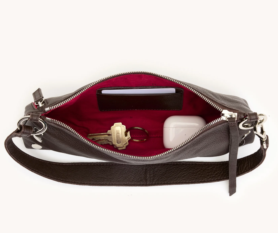 - Crafted with soft pebbled leather featuring a short fringe detail