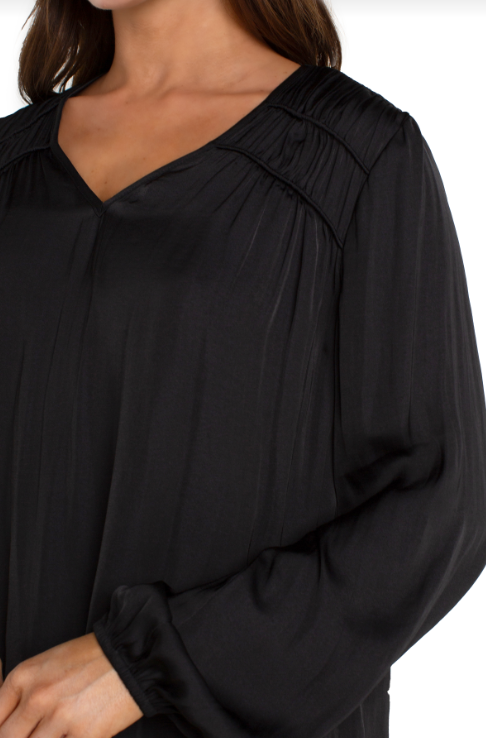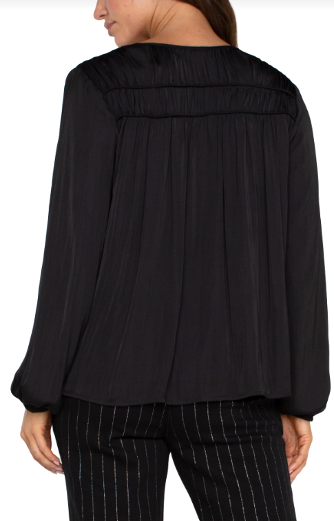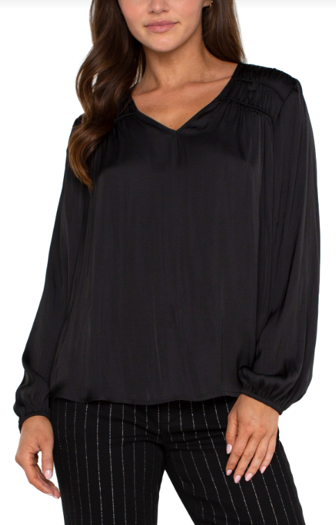 Sure to be your go to blouse, this is super soft, very flattering and looks great either front tucked or left out.