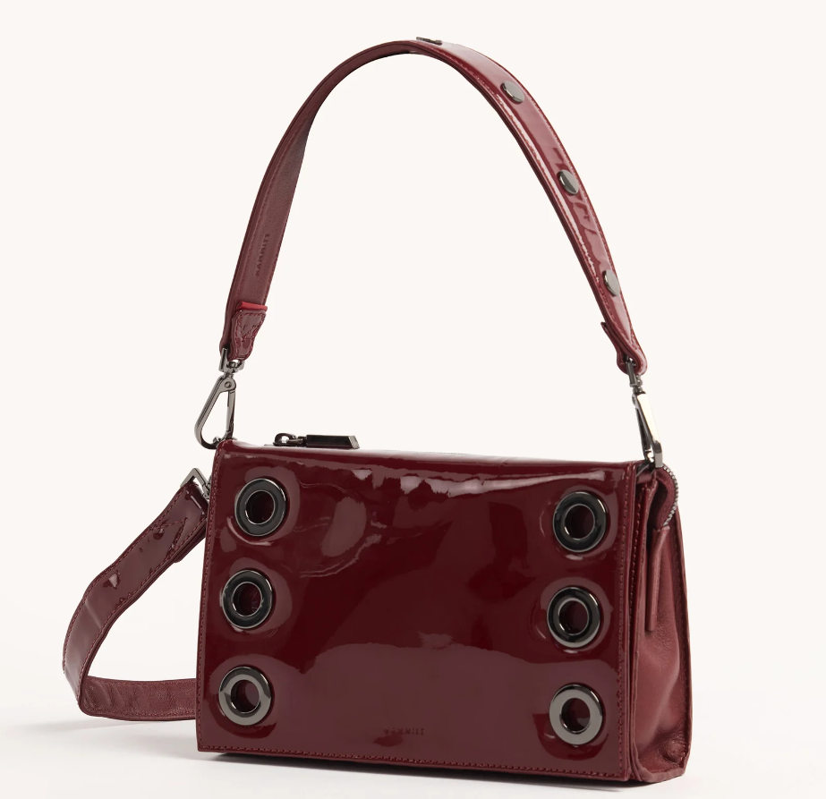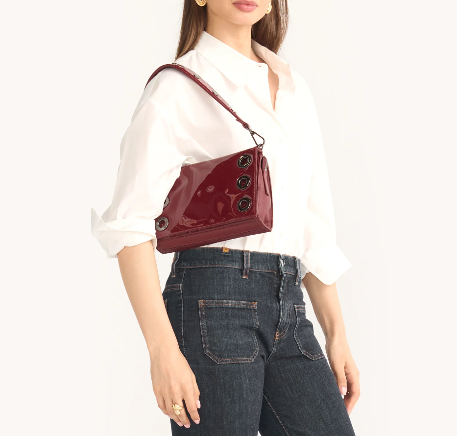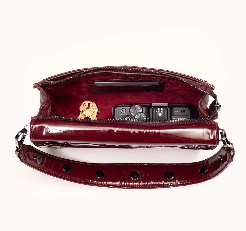 It doesn't get more iconic than this. We're re-introducing our Montana Clutch, now with bold details that celebrate our heritage. This clutch includes a vintage-style Hammitt strap, complete with a bonus riveted short strap, and grommets. With three compartments, this bag is functional and soon to be your everyday go-to. Step into the spotlight with our Pirouette Patent collection, featuring a luxurious Italian patent leather that shines in dazzling form. This deep burgundy red hue captures the dramatic essence of the holiday season, reflecting light from every angle to create a captivating glimmer. The laminate finish is smooth to the touch, while the patent's reflective surface mirrors the elegant twirl of a pirouette.