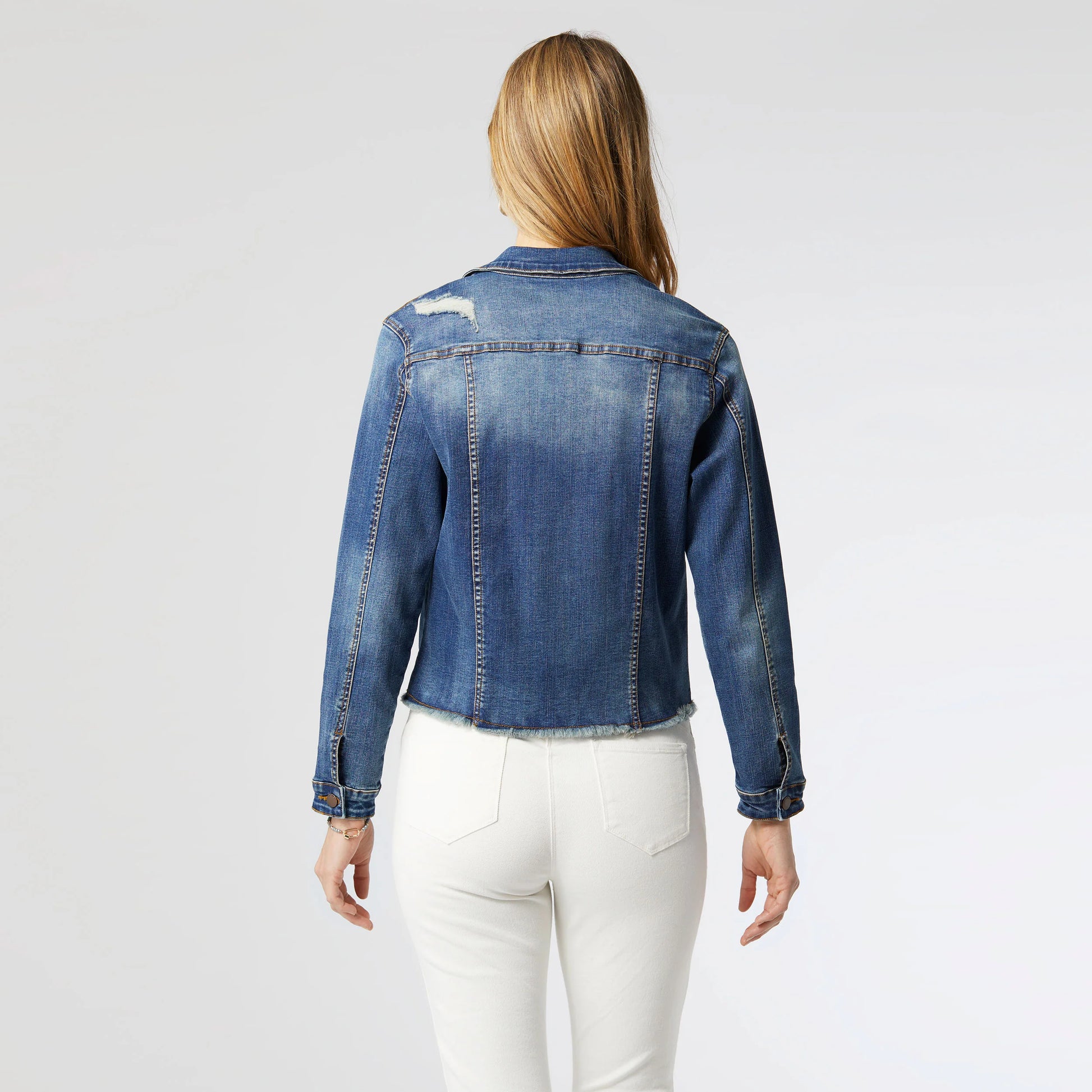 The search for the perfect denim jacket ends here. Distressed details add a hint of edge to this classic wardrobe staple. Material(s): Cotton/Polyester/Spandex.
