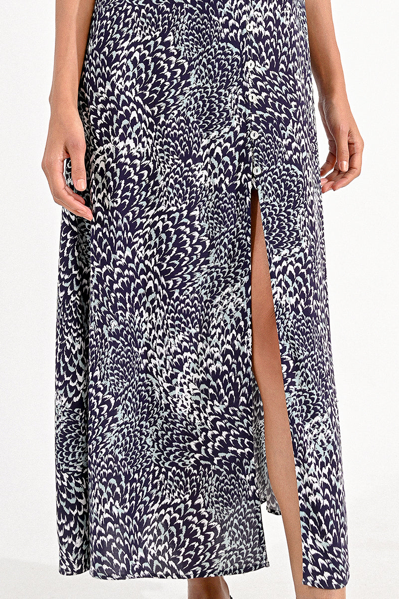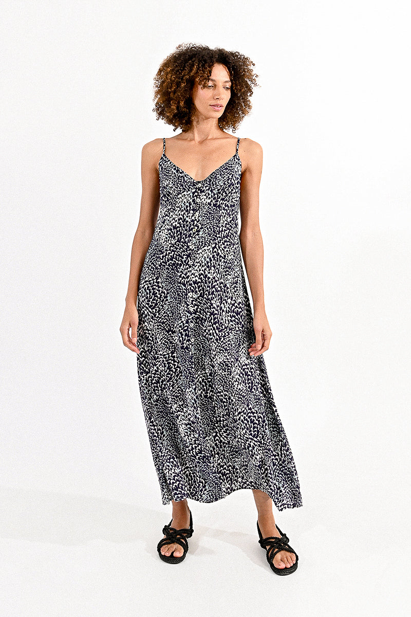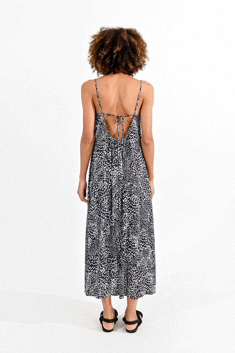 A trendy summer dress, we love the flared cut and feminine details: thin straps and halterneck with tie, buttoned to the knee