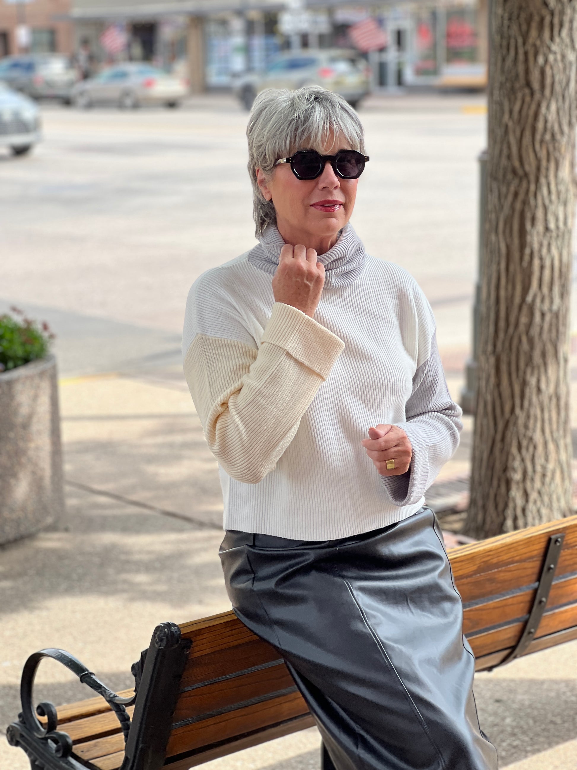 Waiste length t-neck sweater with great sleeves! Slight bell shaper can be worn long iver your fingers or cuffed for some attitude.