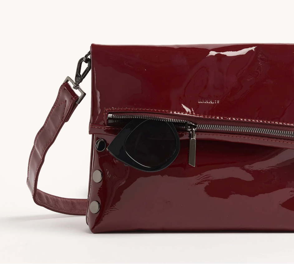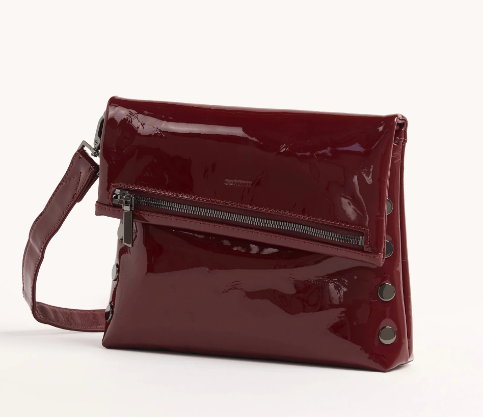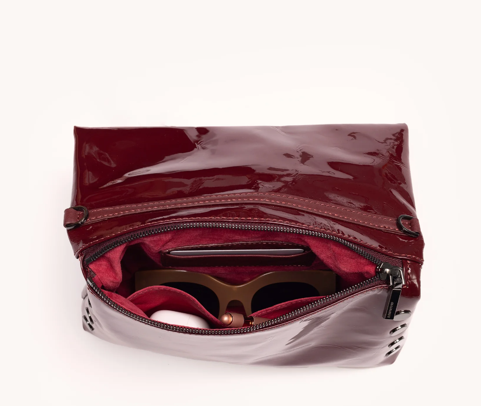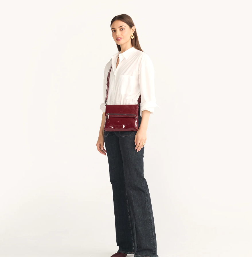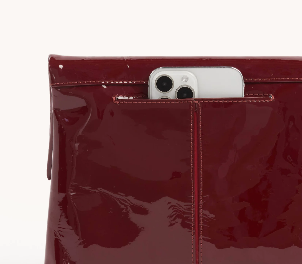 Because you're a VIP. Our all-time best-seller, this VIP clutch features an optional strap and subtle embossed rivets. From two zippered pockets to a credit card slot, two interior drop pockets, and an exterior phone pocket, this bag was designed with intention and organization in mind. Plus, you'll find a subtle strip of red peeking out along the bag's back seam. We're classy like that. Step into the spotlight with our Pirouette Patent collection, featuring a luxurious Italian patent leather that shines in dazzling form. This deep burgundy red hue captures the dramatic essence of the holiday season, reflecting light from every angle to create a captivating glimmer. The laminate finish is smooth to the touch, while the patent's reflective surface mirrors the elegant twirl of a pirouette.
