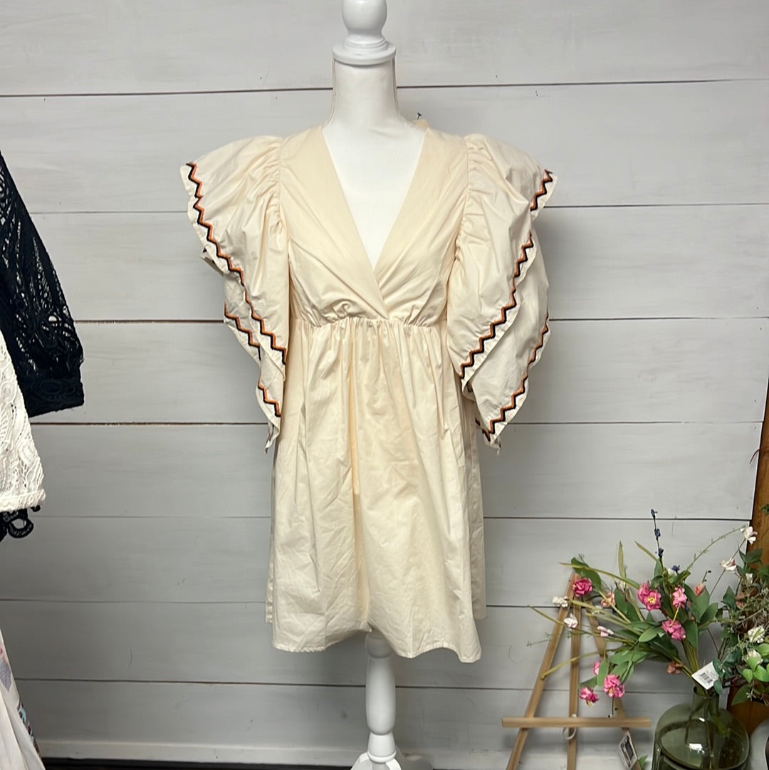 Cream, adorable mini dress with exaggerated flutter sleeves.